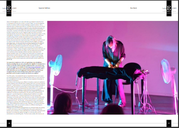 Combining her background as an experimental musician/sound artists with multimedia, installation art and performance, she explores the cross-field between analogue and digital technology, examining how tools and technology shape creative processes and the subjective production of meaning in context of Cybernetics.